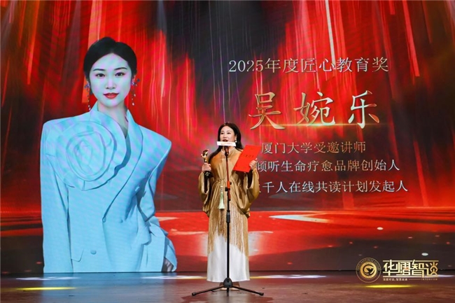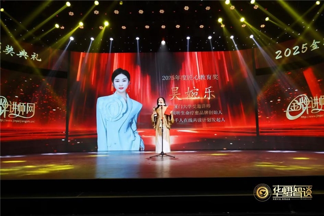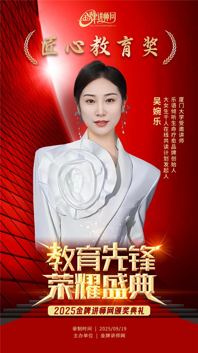 9月19日,由金牌讲师网主办、香港文化发展研究会支持的“匠心筑梦·育见未来——教育先锋荣耀盛典”暨2025金牌讲师网颁奖盛典在北京星光影视基地圆满落幕。乐语倾听生命疗愈品牌创始人、中国东方研究会美育工作委员会客座教授吴婉乐,凭借近二十九年在生命疗愈与家庭教育领域的深耕细作,以及对教育匠心的极致追求,成功斩获“匠心教育奖”,成为盛典中备受瞩目的教育先锋代表。
