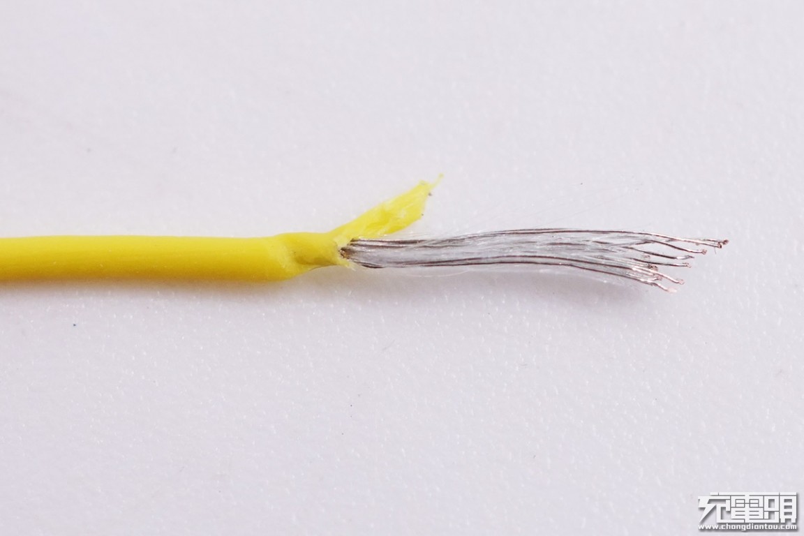 剥开锡纸,内部除了5根线芯,线芯外侧还有一根抗拉纤维组成的抗拉线,抗拉纤维分布在两端可以平衡整根数据线的抗拉性能。